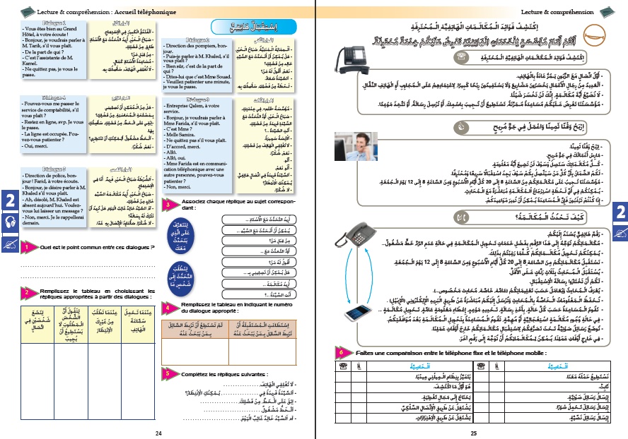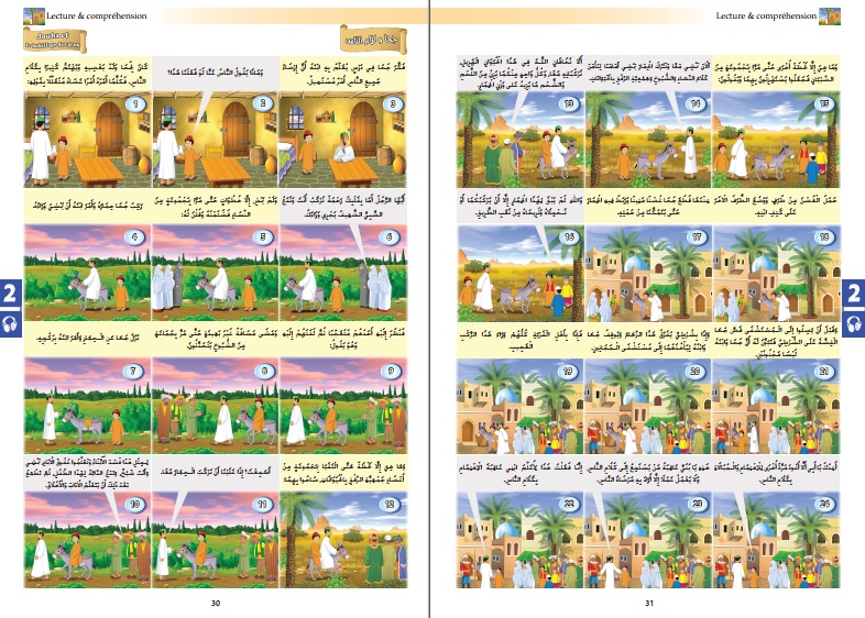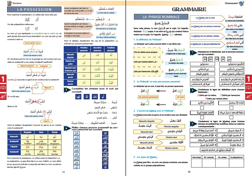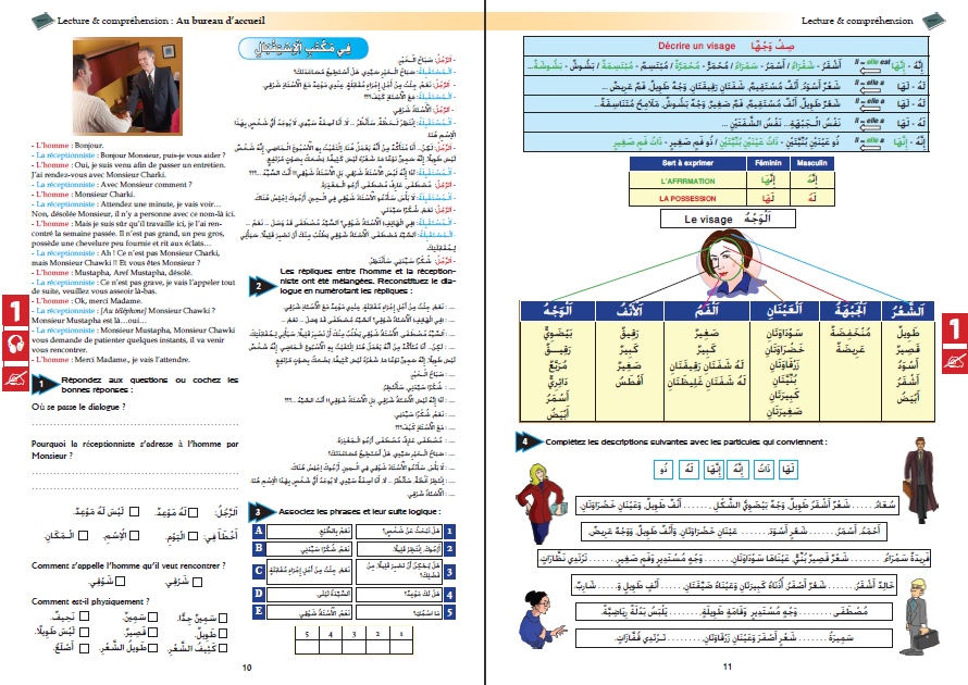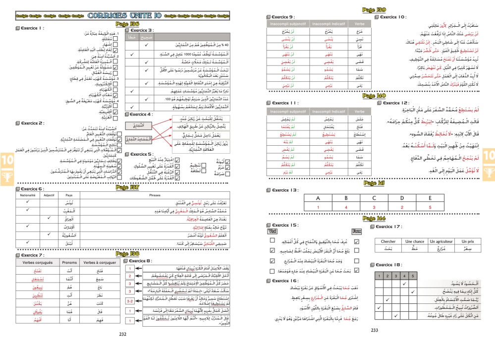 Aussi, vous retrouverez, au niveau de chaque unité, une fiche complète d’un des pays du monde arabe pour partir à la découverte des particularités de ce dernier. En outre, des rubriques culturelles y figurent permettant de survoler plusieurs thèmes tels que la civilisation, la calligraphie, la littérature, l’art et la cuisine arabes ; de même, les histoires des prophètes Joseph et Moïse y sont relatées, révélant des leçons de foi et de comportement. L’annexe, quant à elle, comprend les règles de conjugaison des verbes réguliers et irréguliers avec des exemples, un tableau récapitulatif du lexique du livre, et les corrigés des exercices.