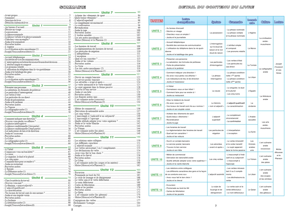 Ce livre comporte douze unités et une annexe. Chaque unité est constituée d’un texte introductif, servant de support, vous aidant à communiquer parfaitement aussi bien à l’oral qu’à l’écrit ; des cours de grammaire et de syntaxe, permettant de maîtriser le fonctionnement de la langue arabe ; des activités générales, représentant des scènes de la vie quotidienne et une bande dessinée humoristique avec le célèbre personnage de Jouha. Toutes ces parties sont suivies d’exercices visant à évaluer votre compréhension et dont les corrections figurent à la fin du livre.