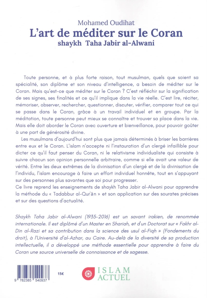 Les musulmans d’aujourd’hui sont plus que jamais déterminés à briser les barrières entre eux et le Coran. L’islam n’accepte ni l’instauration d’un clergé infaillible pour dicter ce qu’il faut penser du Coran, ni le relativisme individualiste qui consiste à suivre chacun son opinion personnelle arbitraire, comme si elle avait une valeur de vérité. Entre les deux extrêmes de la divinisation d’un clergé et de la divinisation de l’individu, l’islam encourage à faire un effort individuel honnête, tout en s’appuyant sur des personnes plus savantes que soi pour progresser. Ce livre reprend les enseignements de shaykh Taha Jabir al-Alwani pour apprendre la méthode du « Tadabbur al-Qurʾān » et son application sur des sourates précises et sur des questions d’actualité.