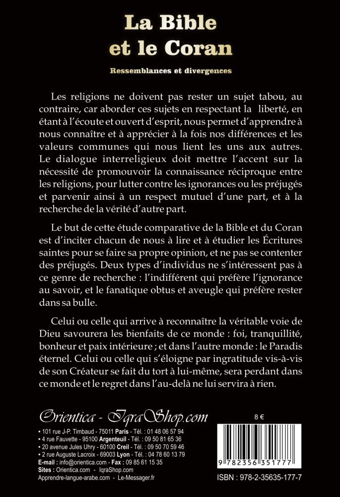 Le but de cette étude comparative de la Bible et du Coran est d’inciter chacun de nous à lire et à étudier les Écritures saintes pour se faire sa propre opinion, et ne pas se contenter des préjugés. Deux types d’individus ne s’intéressent pas à ce genre de recherche : l’indifférent qui préfère l’ignorance au savoir, et le fanatique obtus et aveugle qui préfère rester dans sa bulle.