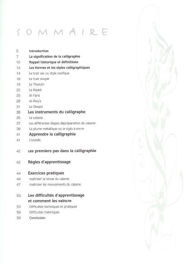 Il propose une méthode d'apprentissage, jalonnée de conseils pratiques et de réflexions. Le futur calligraphie tentera à son tour de maîtriser le calame et n'hésite pas à se lancer dans la méthode des points. Le débutant, déjà stimulé, peut choisir ses gestes, gérer des proportions et l'espacement des lettres, se développe ainsi une approche personnelle de la calligraphie.