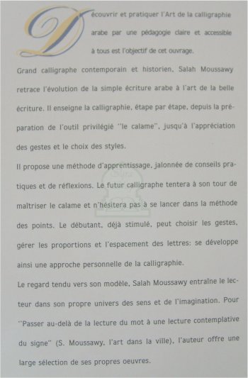 Grand calligraphe contemporain et historien, Salah Moussawy retrace l'évolution de la simple écriture arable à l'art de la belle écriture arabe à l'art de la belle écriture. Il enseigne la calligraphie, étape par étape, depuis la préparation de l'outil privilégié le calame, dans l'appréciation des gestes et le choix des styles.