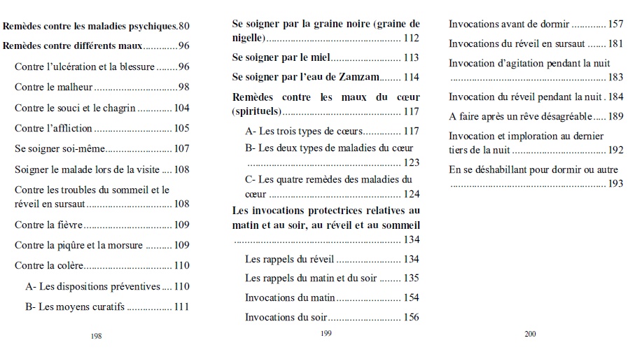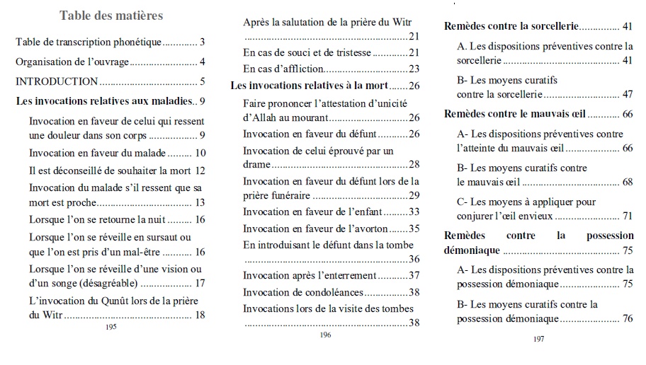 Vous trouverez dans ce livre les invocations prophétiques authentiques relatives aux maladies ainsi que les remèdes contre différents maux spirituels et physiques tels que la sorcellerie, le mauvais œil, la possession démoniaque, les maladies psychiques, l'ulcération, la blessure, le malheur, les troubles du sommeil, la colère, etc. Sont également exposés les différents moyens curatifs utilisés (la graine noire de nigelle, le miel, l'eau de Zamzam, etc.) ainsi que les invocations protectrices, en essayant de rassembler les rappels que le cheikh Al-Albânî a authentifiés. Le texte du livre est bilingue (français et arabe vocalisé) et une grande partie des invocations sont également transcrites en phonétique.