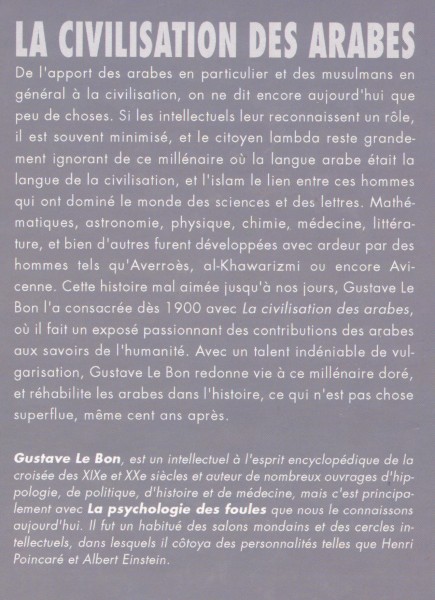 Cette histoire mal aimée jusqu'à nos jours se voit consacré un ouvrage dès 1900 par Gustave le Bon avec "La civilisation des arabes".Il y fait un exposé passionnant de la contribution des arabes aux savoirs de l'humanité. Avec un talent indéniable de vulgarisation, l'auteur redonne vie à ce millénaire doré, et réhabilite les arabes dans l'Histoire en leur rendant justice, ce qui n'est pas superflue plus cent ans après.