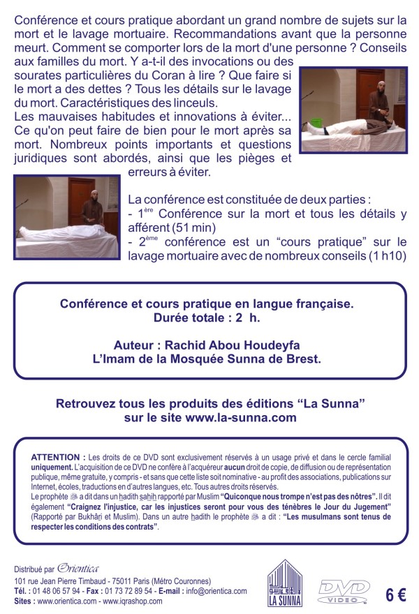 Conférence et cours pratique abordant un grand nombre de sujets sur la mort et le lavage mortuaire. Recommandations avant que la personne meurt. Comment se comporter lors de la mort d'une personne ? Conseils aux familles du mort. Y a-t-il des invocations ou des sourates particulières du Coran à lire ? Que faire si le mort a des dettes ? Tous les détails sur le lavage du mort. Caractéristiques des linceuls. Les mauvaises habitudes et innovations à éviter... Ce qu'on peut faire de bien pour le mort après sa mort. Nombreux points importants et questions juridiques sont abordés, ainsi que les pièges et erreurs à éviter.