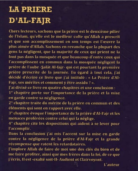 Chers lecteurs, sachons que la prière est le deuxième pilier de l'Islam, qu'elle est le meilleur culte qu'Allah a prescrit et que son accomplissement en son temps est l'œuvre la plus aimée d'Allah. Sachons en revanche que la plupart des gens la négligent, que la majorité de ceux qui prient ne la font pas dans la mosquée et que beaucoup d'entre ceux qui l'accomplissent en commun dans la mosquée négligent la prière de l'aube - Salat al Fajr - qui est pourtant la première prière prescrite de la journée. Eu égard à tout cela, j'ai décidé d'écrire ce livre que j'ai intitulé : "La prière d'Al Fajr, ses mérites et comment y être assidu?"