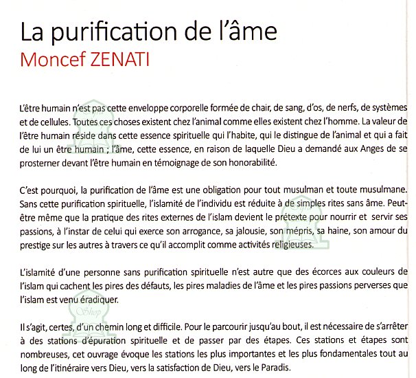 L' Humain n'est pas cette enveloppe corporelle formée de chair, de sang, d'os, de nerfs, de systèmes et de cellules. Toutes ces choses existent chez l'animal comme elles existent chez l'homme. La valeur de l'être humain réside dans cette essence spirituelle qui l'habite, qui le distingue de l'animal et qui a fait de lui un être humain. C'est pourquoi, la purification de l'âme est une obligation pour tout musulman et toute musulmane. Sans cette purification spirituelle, l'islamité de l'individu est réduite à de simple rites sans âme.