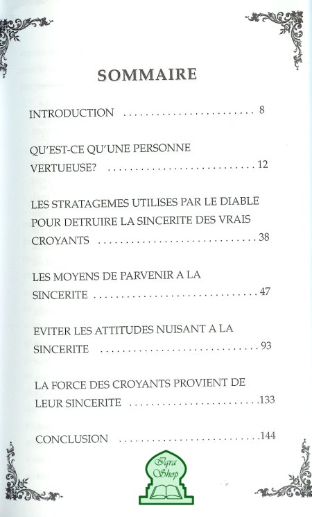 La sincérité est le fait "d'agir selon les commandements de Dieu,sans y attendre le moindre bénéfice personnel ou quoi que ce soit en retour". Une personne sincère se dirige vers Dieu avec son coeur en ne cherchant qu'à gagner son consentement dans la moindre de ses actions. Dans de nombreux versets coraniques , l'attention est portée sur les bonnes actions accomplies "seulement pour Dieu". Cependant, certaines personnes ont tendance à sous-estimer ce fait. Elles ne réfléchissent jamais à la pureté de leur intention,que se soit en acceptant un travail, en donnant un discours ou en aidant des personnes; elles croient que leurs actions sont suffisantes et qu'elles "remplissent leurs devoirs religieux". Dieu nous parle de ceux qui font des efforts en vain durant toute leur vie. Ils seront confrontés à la situation suivante le Jour de Jugement : "Ce jour là, il y aura des visages humiliés, préoccupés, harassés" (sourate 88, al-Ghashiyya : 2-3). Dans ce livre, nous allons parler des deux aspects de la foi qui rendent les actions constructives et valables aux yeux de Dieu ,à savoir la purification de soi et la sincérité. Ce livre a pour but d'avertir ceux qui échouent à vivre simplement pour gagner l'agrément de Dieu.Il les invite donc à se purifier avant le Jour du Jugement et mentionnant les moyens permettant de protéger sa sincérité au regard des versets du Coran.