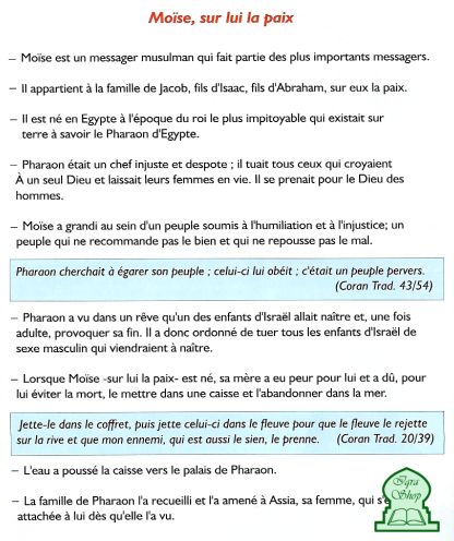 La première partie traite du dogme (croyance aux prophètes, aux anges...). Ensuite, l'explication claire et concise des cinq piliers de l'islam, puis les batailles menées par le prophète en bandes dessinés,rappel de quelques qualité du musulman et enfin, une présentation du coran (bienfaits, règles de tajwid et quelques sourates).