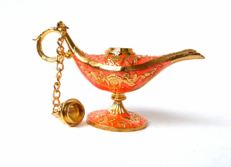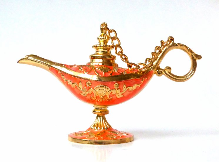 Très bel objet décoratif, cette lampe d'Aladin métallique, dorée et décorée de couleur corail est fournie avec sa boîte cadeau.