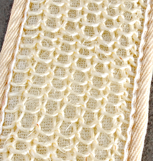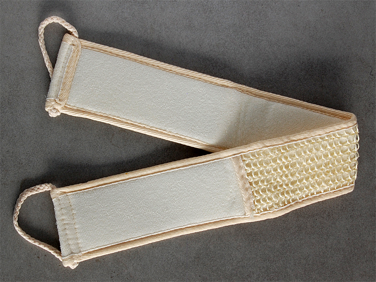 Lanière exfoliante pour frotter le dos lors du bain ou hammam, avec couche en fibre naturelle avec une rugosité optimale (ni trop rugueuse, ne trop lisse) pour aider à la desquamation des peaux mortes.