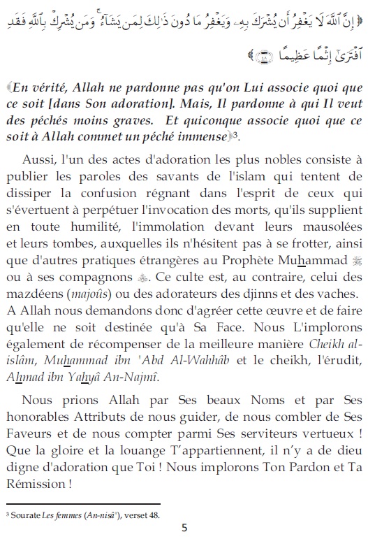 «Les trois (3) principes fondamentaux» écrit par Cheikh al-Islâm Muhammad Ibn ‘Abd Al-Wahhâb fait partie des principaux ouvrages au moyen desquels le cheikh a réfuté les croyances de ceux qui ont dévié du monothéisme (tawhîd) en vouant leur culte à d’autres qu’Allah et en Lui donnant des associés dans Son adoration sans s’appuyer sur la moindre preuve qu’Il ait révélée. Or chacun sait que le polythéisme (chirk) est, de tous les péchés, celui qui est le plus grave.