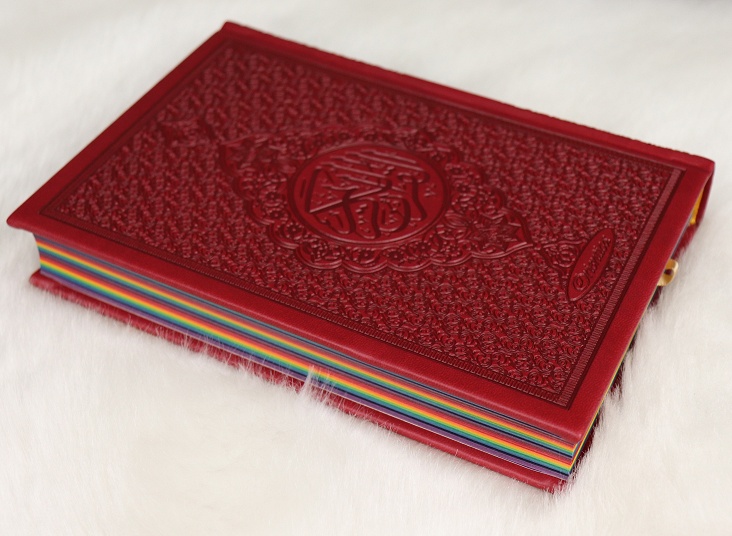Dans ce magnifique Coran chaque partie (Jouz') est colorée avec une couleur différente, avec un dégradé sous forme d'arc-en-ciel. Ce qui aide l'apprentissage la révision du Coran.