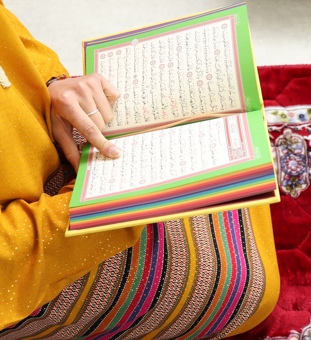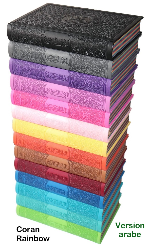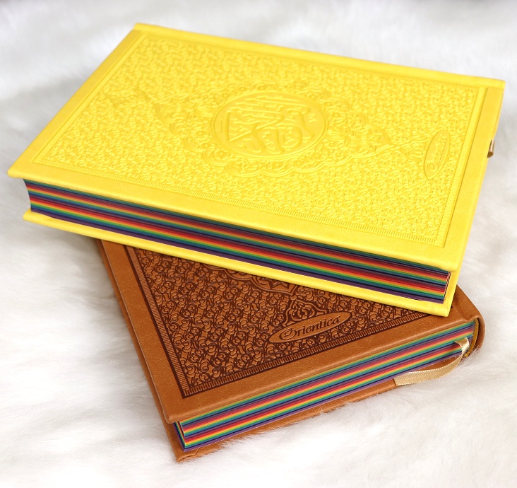 Dans ce magnifique Coran chaque partie (Jouz') est colorée avec une couleur différente, avec un dégradé sous forme d'arc-en-ciel. Ce qui aide l'apprentissage la révision du Coran.