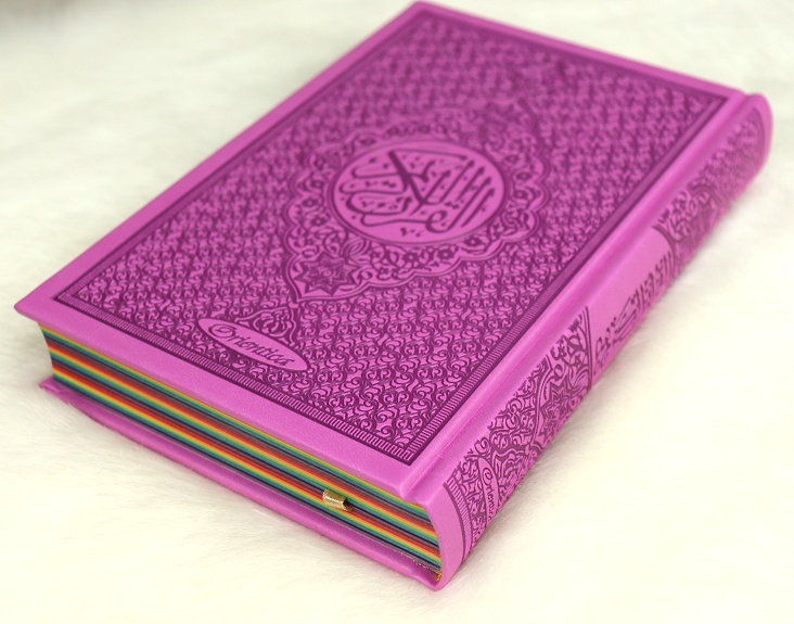 Dans ce magnifique Coran chaque partie (Jouz') est colorée avec une couleur différente, avec un dégradé sous forme d'arc-en-ciel. Ce qui aide l'apprentissage la révision du Coran.