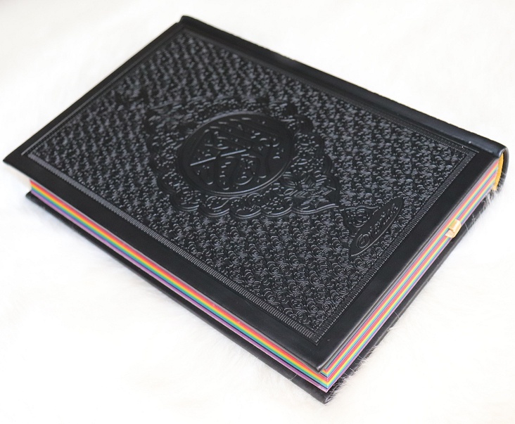 Dans ce magnifique Coran chaque partie (Jouz') est colorée avec une couleur différente, avec un dégradé sous forme d'arc-en-ciel. Ce qui aide l'apprentissage la révision du Coran.