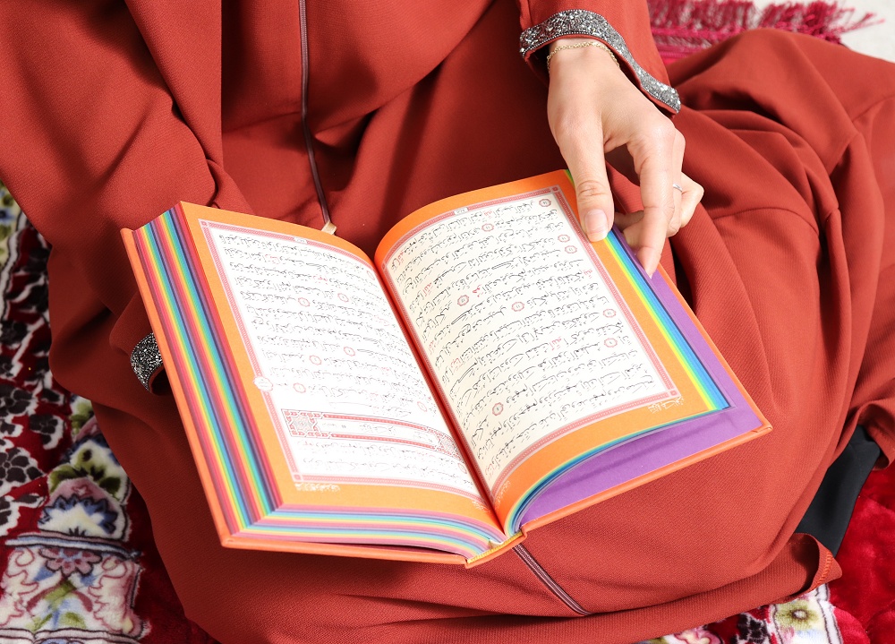 Dans ce magnifique Coran chaque partie (Jouz') est colorée avec une couleur différente, avec un dégradé sous forme d'arc-en-ciel. Ce qui aide l'apprentissage la révision du Coran.