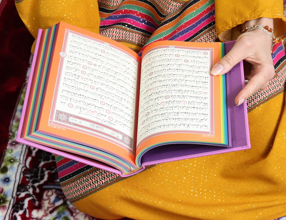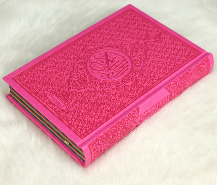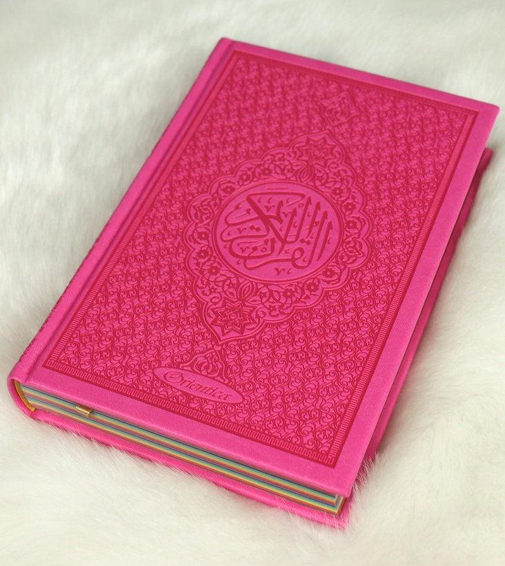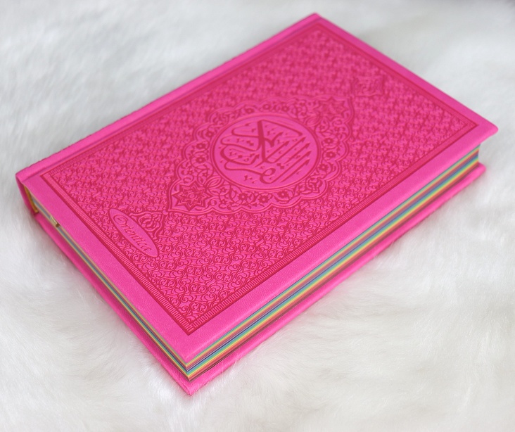 Dans ce magnifique Coran chaque partie (Jouz') est colorée avec une couleur différente, avec un dégradé sous forme d'arc-en-ciel. Ce qui aide l'apprentissage la révision du Coran.