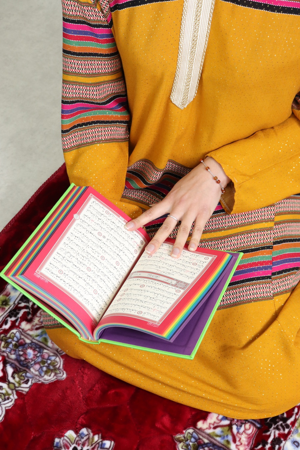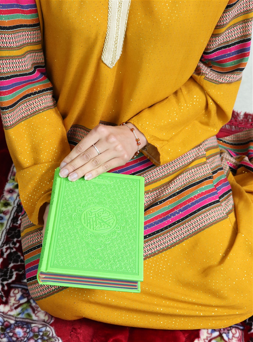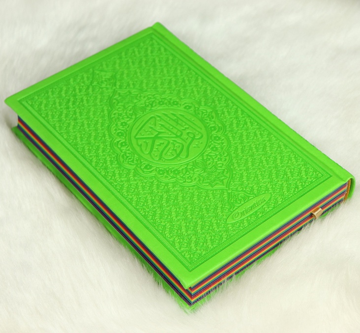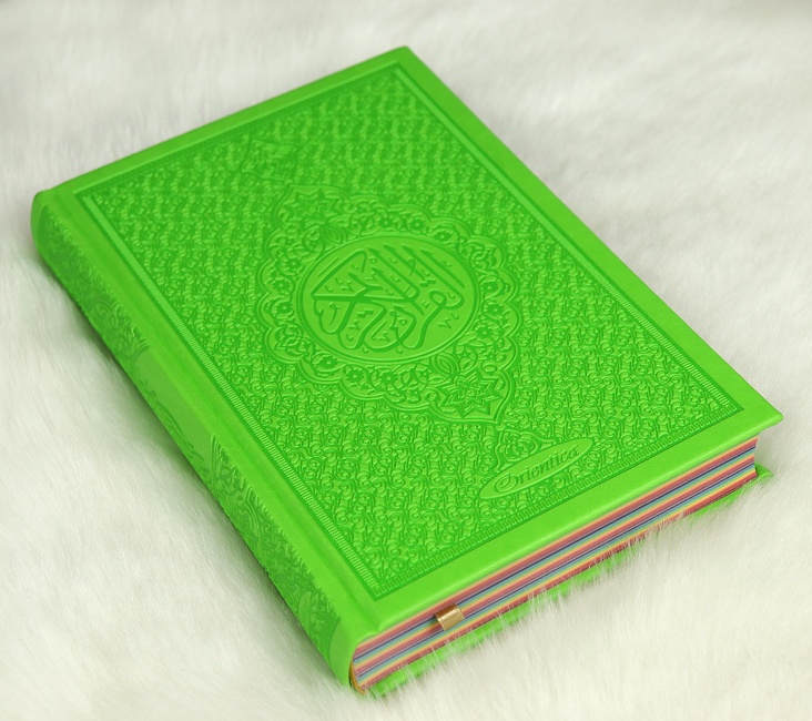 Dans ce magnifique Coran chaque partie (Jouz') est colorée avec une couleur différente, avec un dégradé sous forme d'arc-en-ciel. Ce qui aide l'apprentissage la révision du Coran.