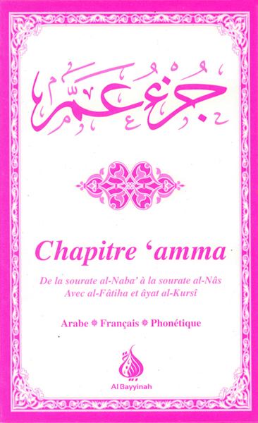 Ce livre au format de poche contient le chapitre 'Amma (Juz' 'Amma - جزء عم), de la sourate Al-Naba(78) à la sourate Al-Nâs(114) avec la sourate Al-Fâtiha et âyat Al-Kursî, en arabe, français et phonétique, avec une couverture rose et des pages imprimées bicolores.