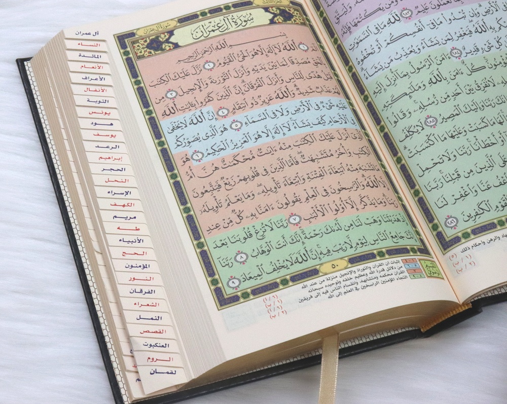 Le Saint Coran en langue arabe (lecture Hafs), avec exégèse thématique : Explication thématique des versets du Coran grâce aux couleurs. Sens général des versets, permet de mieux comprendre et de mémoriser le Coran facilement. Index au niveau du côté pour accéder rapidement à chaque sourate.