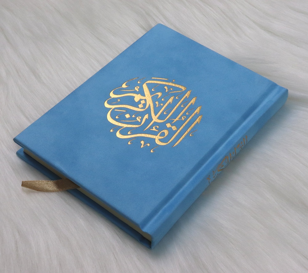 Le Coran couverture rigide de luxe couverture en daim dorée (10 x 14 cm) - Couleur Bleu ciel - مصحف ورق المدينة مخمل Livre