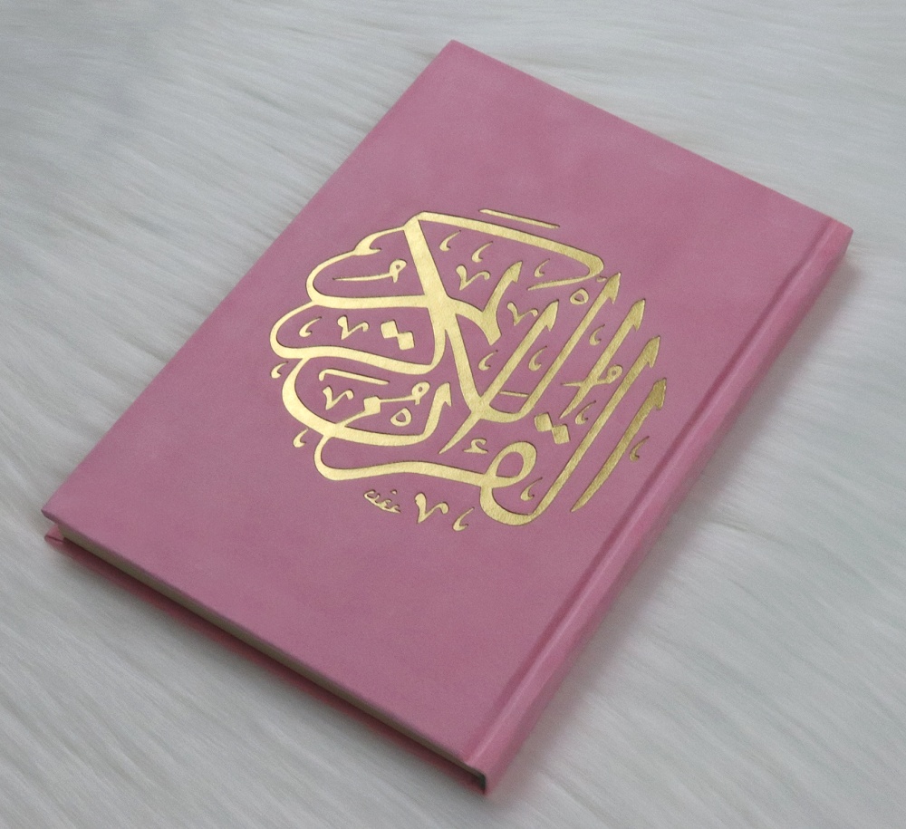 Le Coran couverture rigide de luxe couverture en daim dorée (10 x 14 cm) - Couleur Rose - مصحف ورق المدينة مخمل - REF. 38414 (12.90 €)