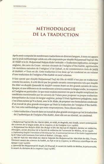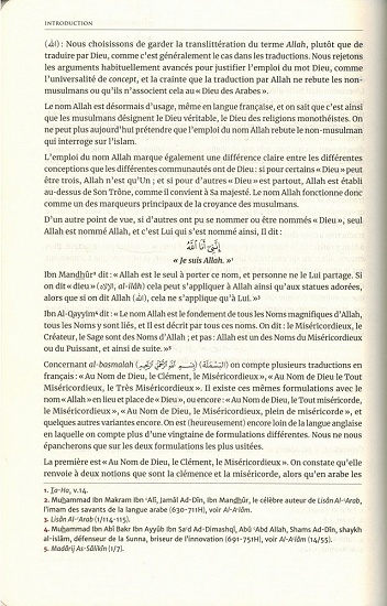 Une traduction. Une de plus pourrait-on dire. On compte aujourd'hui allègrement plus d'une centaine de traductions en langue française et rien ne laisse penser que la cadence va ralentir et ainsi parvenir, pourquoi pas, jusqu'aux plus de trois cents traductions disponibles en Urdu. Ce nombre, tout de même conséquent pour un seul et même texte, peut donner l'illusion au lecteur qu'il a « le choix ». Toutes se parent de mille atours pour démontrer leur caractère inédit, voire essentiel: qu'il s'agisse d'une présentation graphique plus soignée, de préfaces apologétiques, de recommandations élogieuses, de révisions par divers comités et pontes, etc. Mais, à bien les considérer, ce qui surprend le plus est leur étonnante similitude.