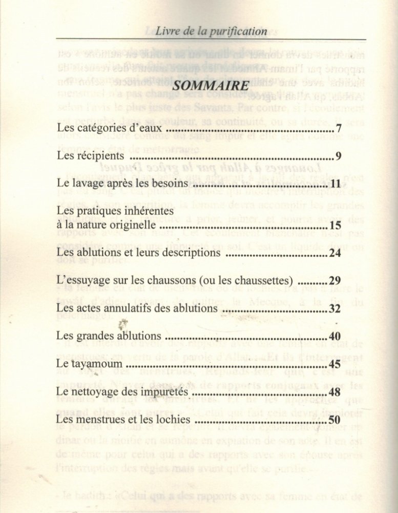 Cet ouvrage en est la première partie. Il regroupe tout ce qui a trait à la purification, les impuretés, le tayamoum, les menstrues et autres sujets dont la connaissance est indispensable à chaque musulman et musulmane. Ces choix se distinguent par leur simplicité et leur clarté.