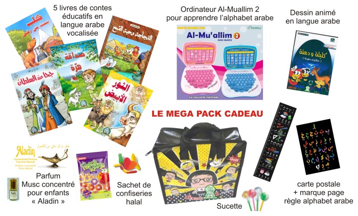 Le Mega Pack Cadeau : Sac surprise "langue arabe" (Ordinateur, Bonbons halal, Livres, DVD, Musc...) pour enfant, école... - REF. 15389 (28.00 €) - En Promotion à 19.90 €