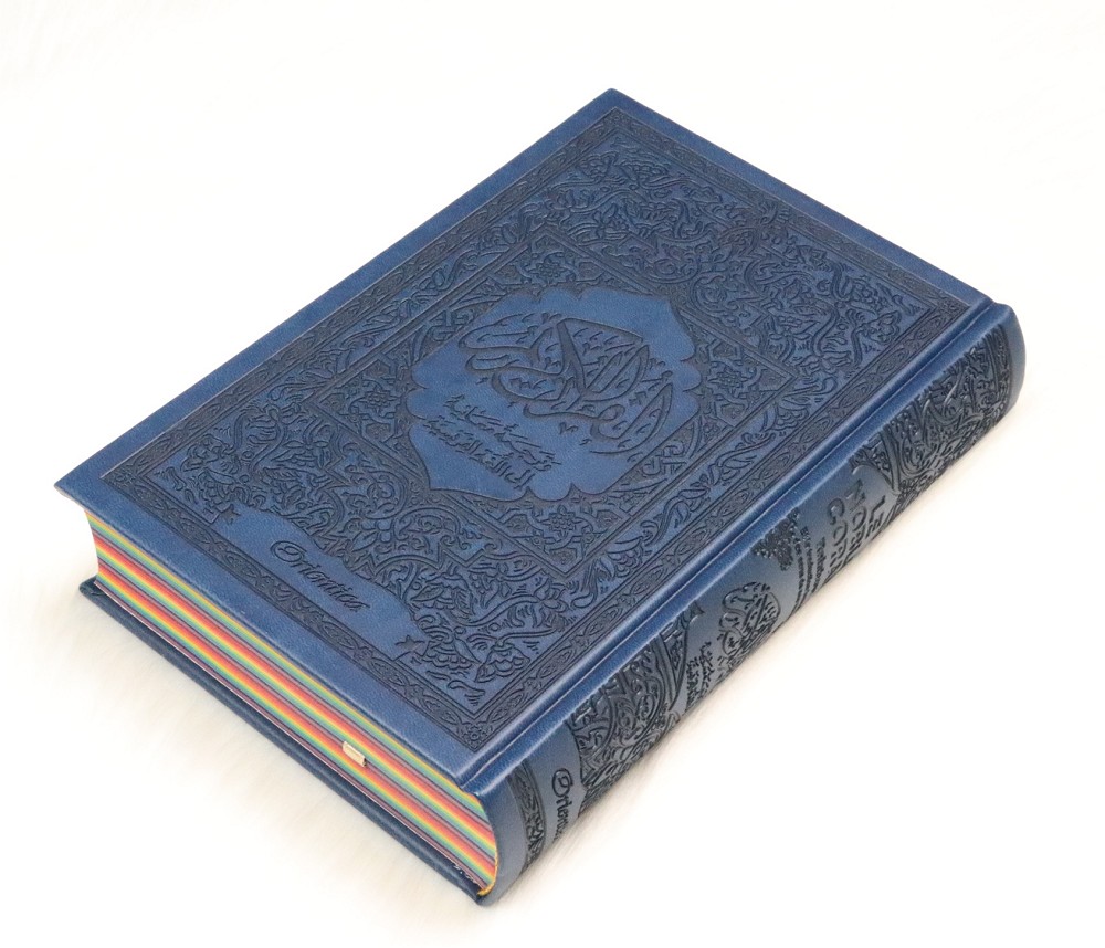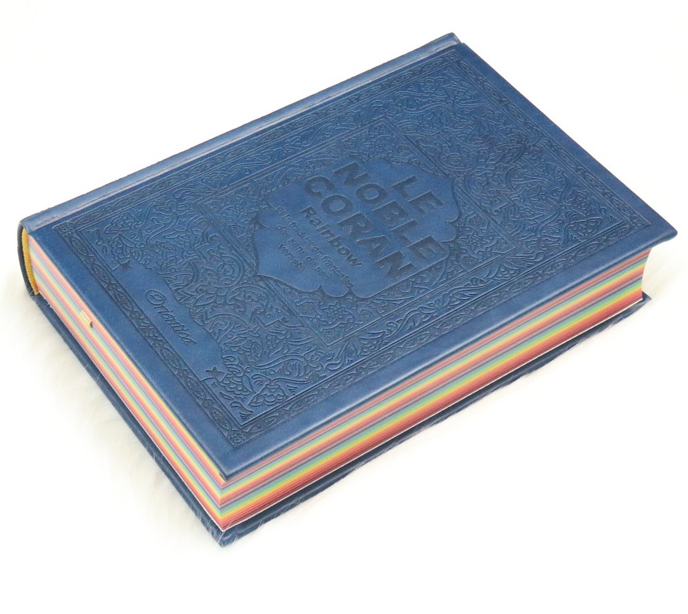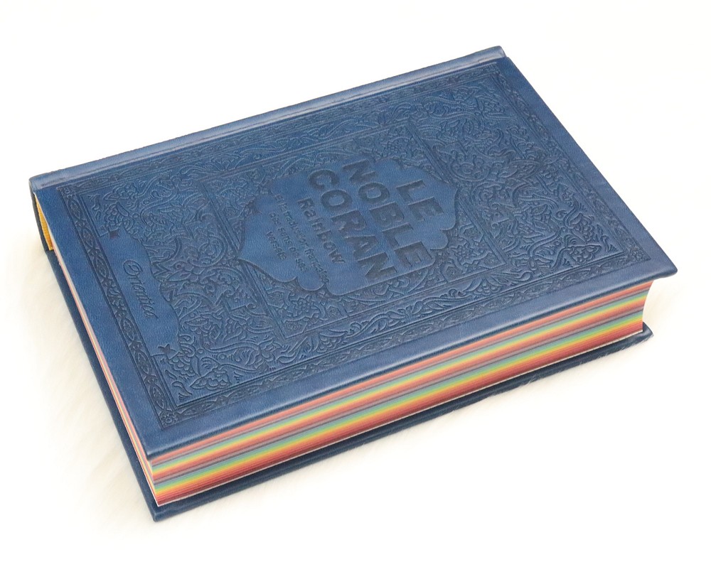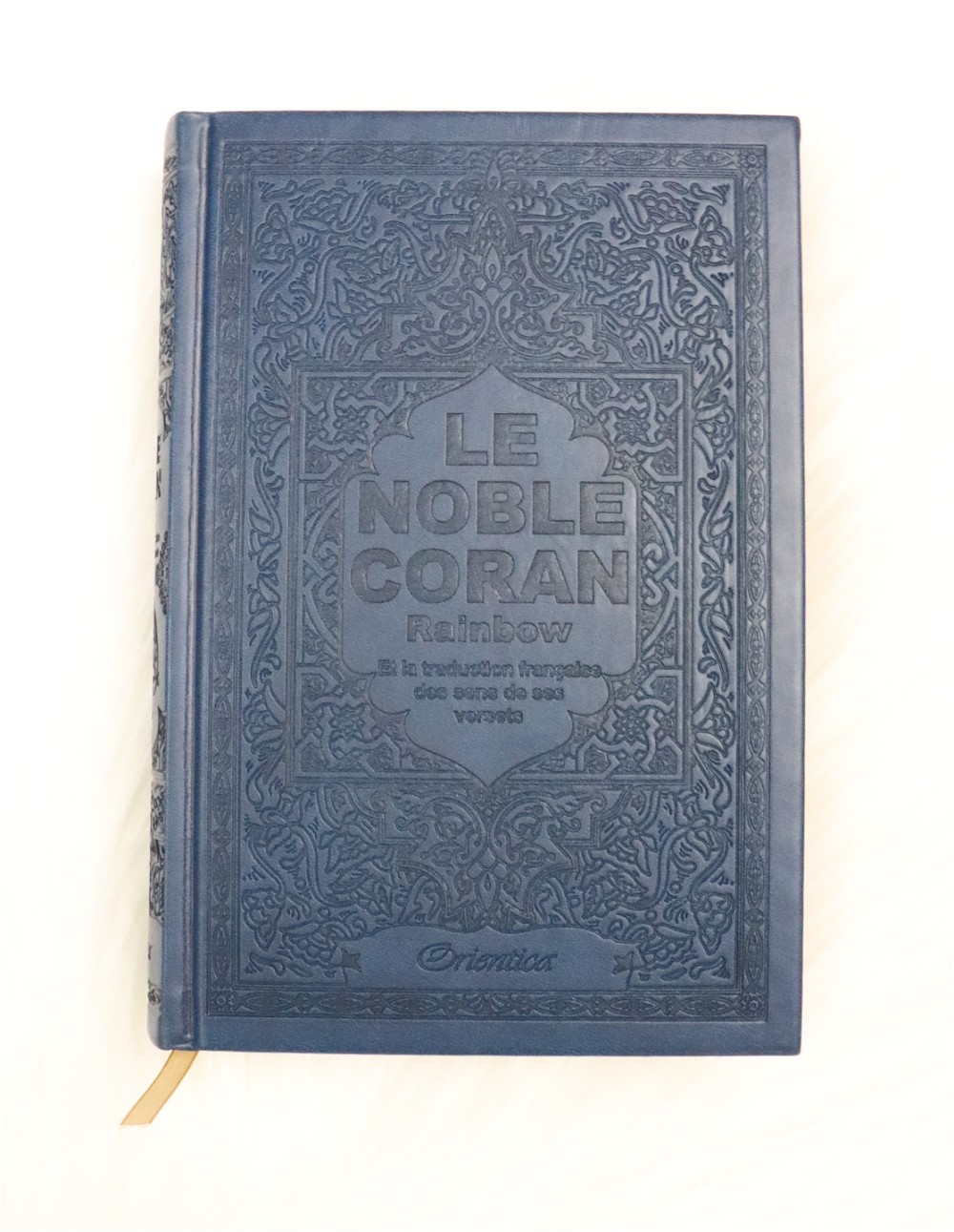 Ce Coran Arc-en-ciel (en anglais "Rainbow Quran") a une couverture cartonnée de type cuir, doux au toucher. Très jolie couleur bleu marine. Idéal pour offrir.