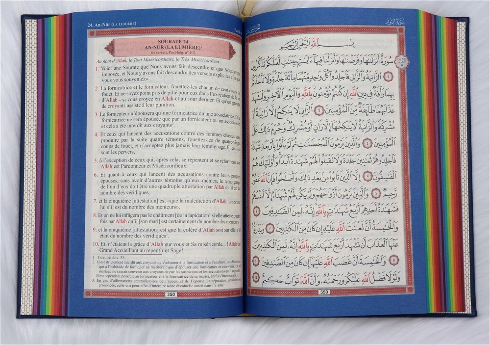 Dans ce magnifique Coran chaque partie (Jouz') est colorée avec une couleur différente, avec un dégradé de couleurs sous forme d'arc-en-ciel. Ce qui aide l'apprentissage et la révision du Saint Coran.