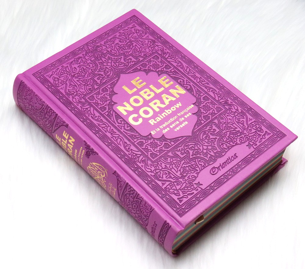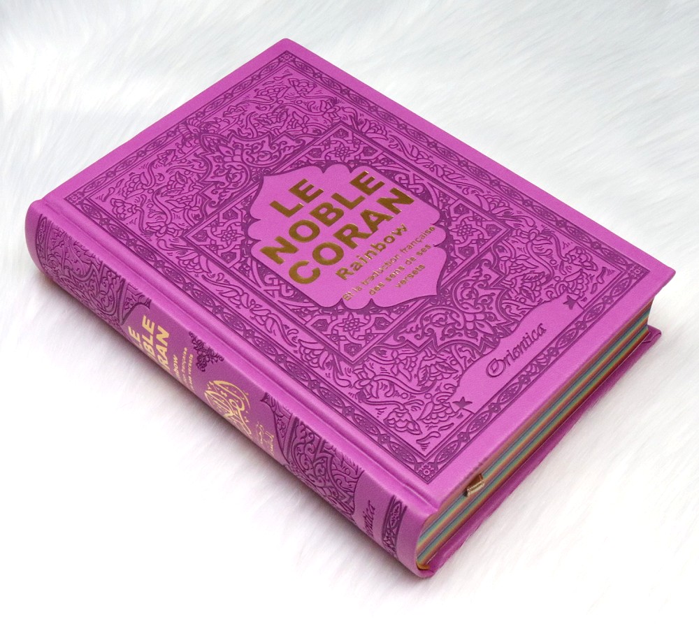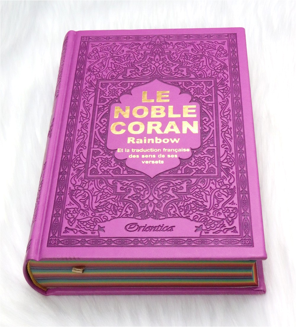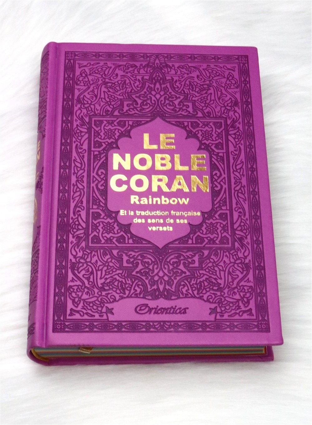 Le Noble Coran avec pages en couleur Arc-en-ciel (Rainbow) - Bilingue (français/arabe) - Couverture Cuir de couleur mauve doré Livre Coup de coeur