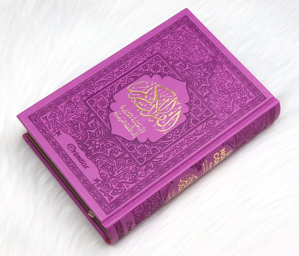 Ce Coran Arc-en-ciel (en anglais Rainbow) a une couverture cartonnée de type cuir, doux au toucher. Très jolie couleur mauve. Idéal pour offrir.