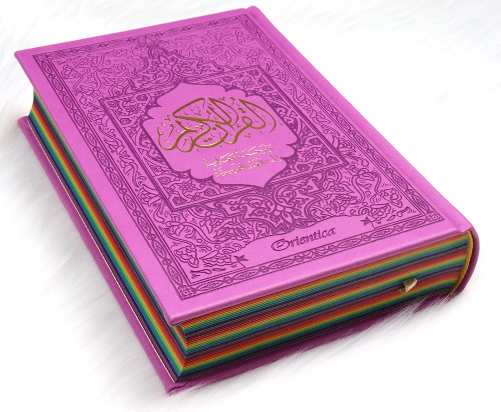 Le Noble Coran avec pages en couleur Arc-en-ciel (Rainbow) - Bilingue (francais/arabe) - Couverture Cuir de couleur mauve dore
