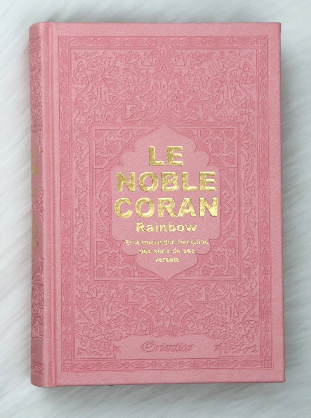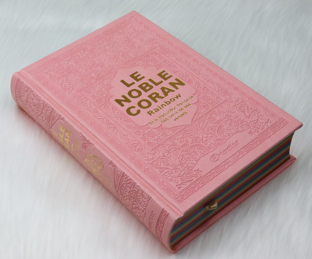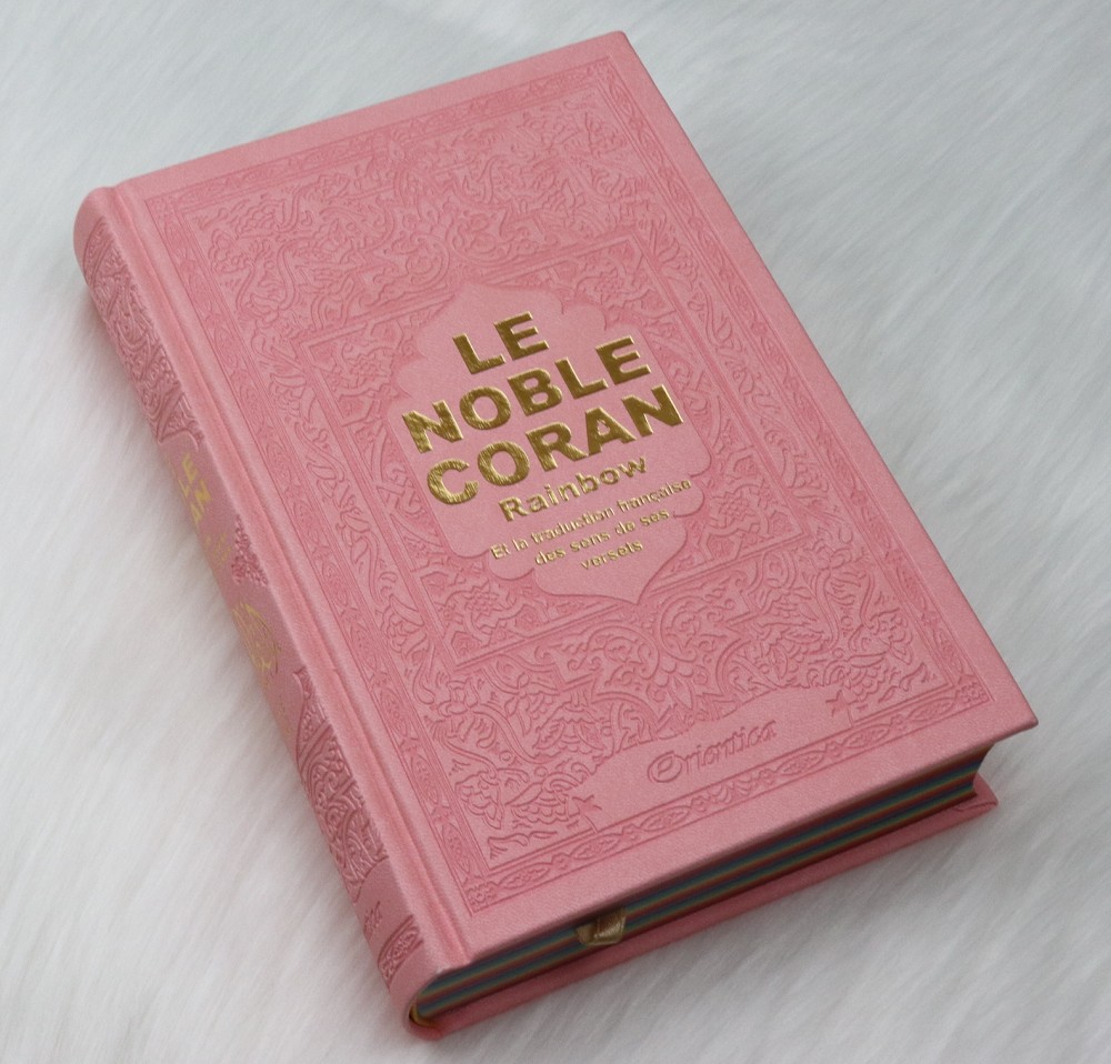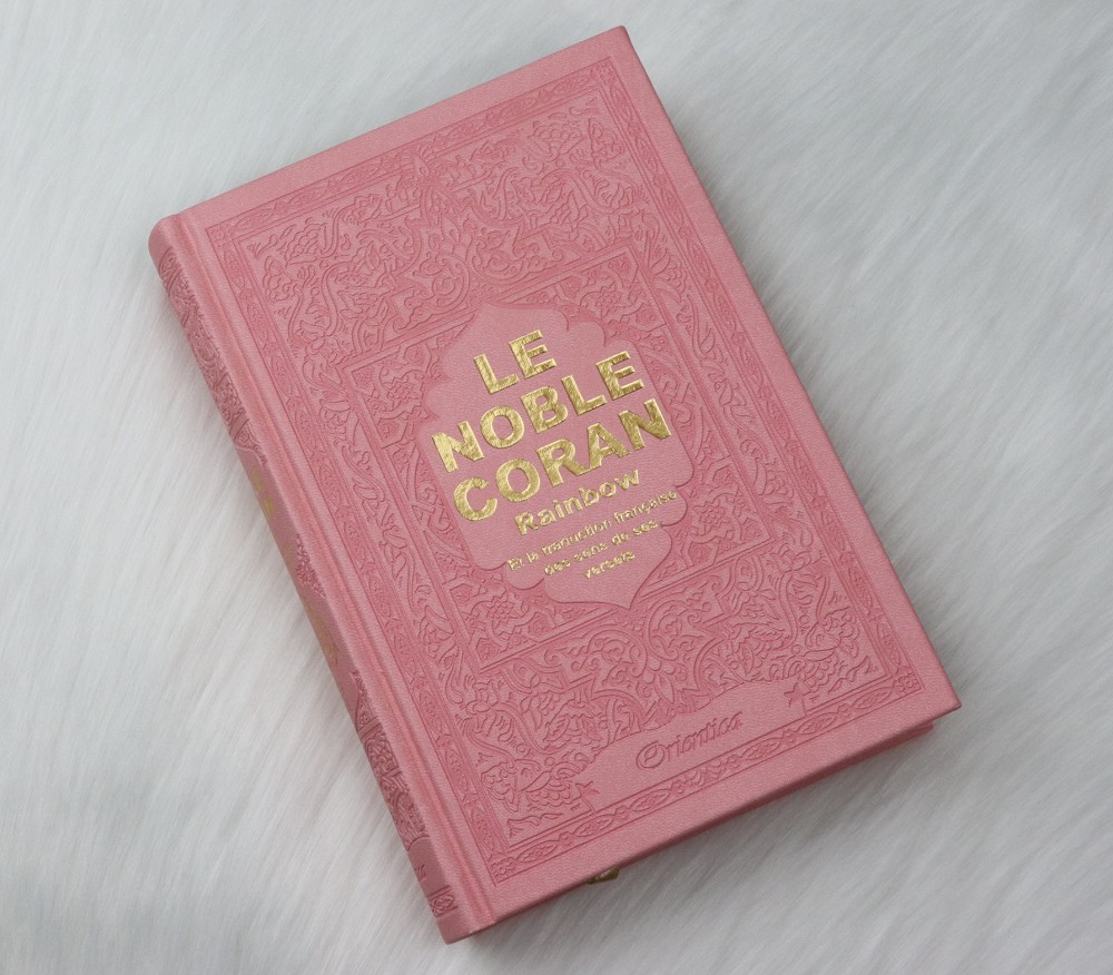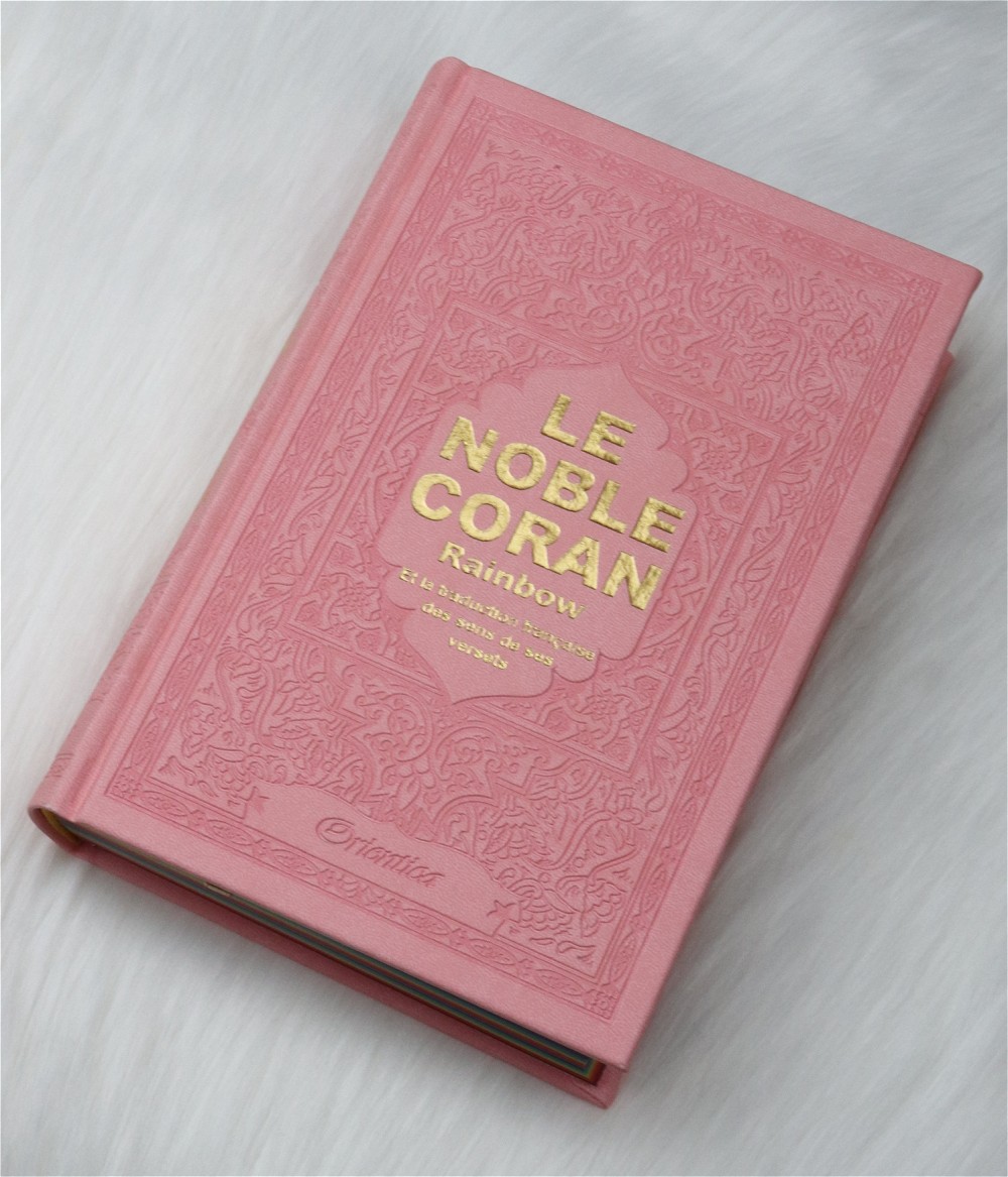 Le Noble Coran avec pages en couleur Arc-en-ciel (Rainbow) - Bilingue (français/arabe) - Couverture Cuir de couleur rose clair doré Livre Coup de coeur