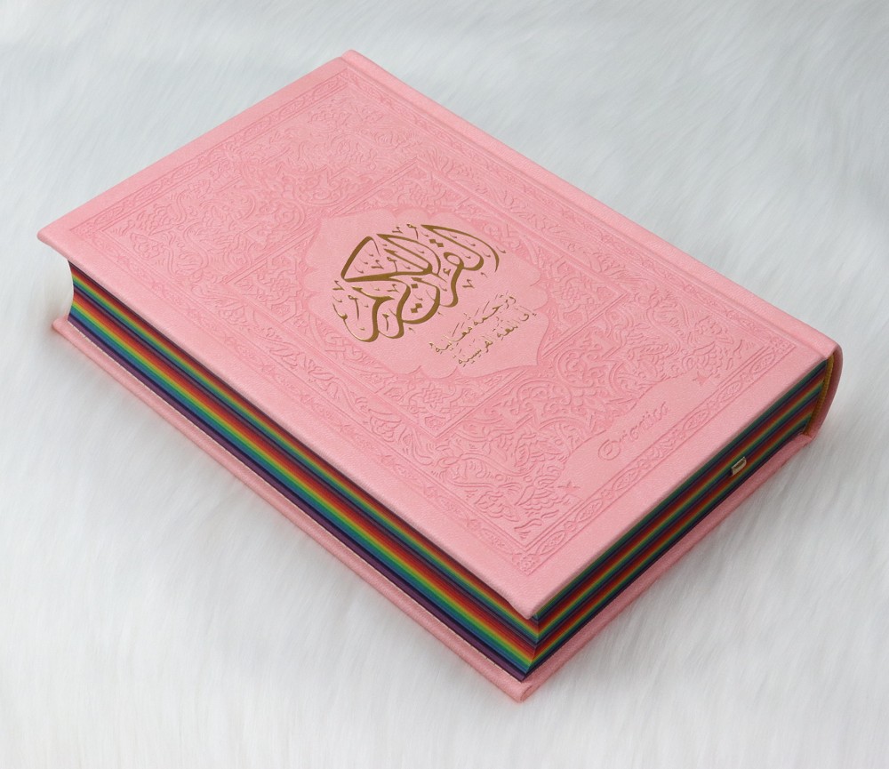 Ce Coran Arc-en-ciel (en anglais "Rainbow Quran") a une couverture cartonnée de type cuir, doux au toucher. Très jolie couleur rose clair pour femmes. Idéal pour offrir.