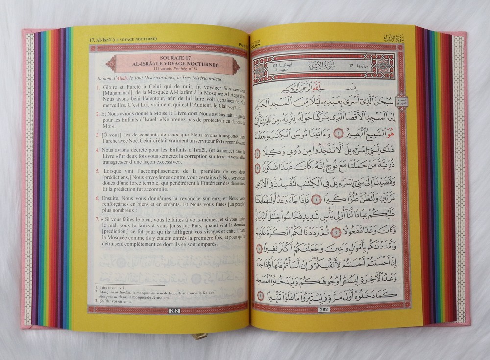 Le Noble Coran avec pages en couleur Arc-en-ciel (Rainbow) - Bilingue (français/arabe) - Couverture Cuir de couleur rose - REF. 23367 (25.00 €)
