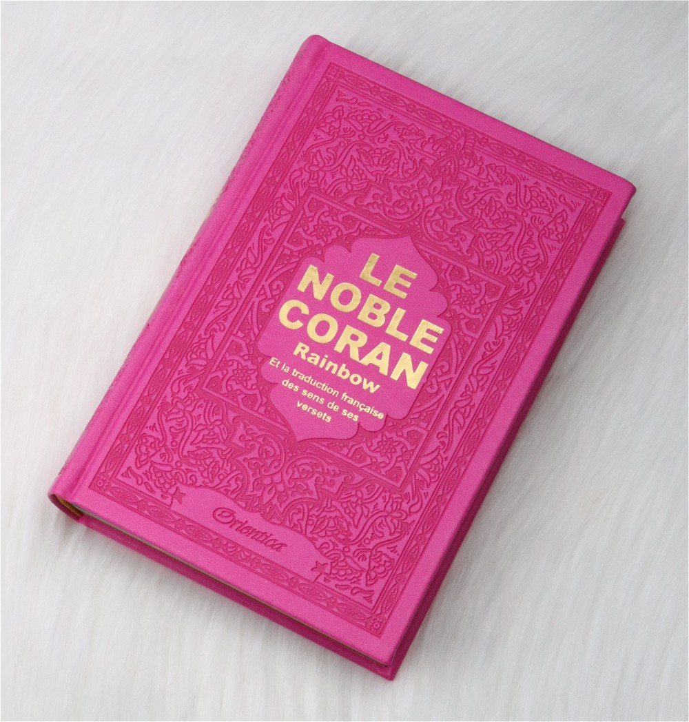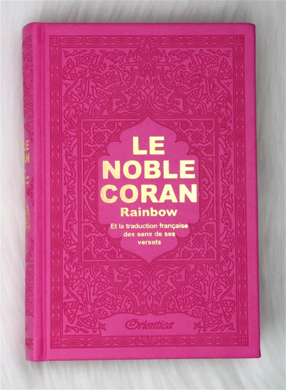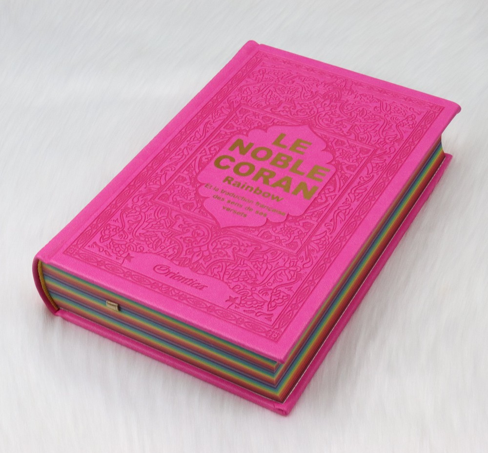 Le Noble Coran avec pages en couleur Arc-en-ciel (Rainbow) - Bilingue (français/arabe) - Couverture Cuir de couleur rose doré Livre Coup de coeur