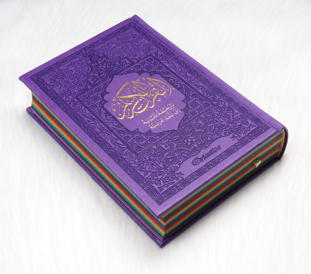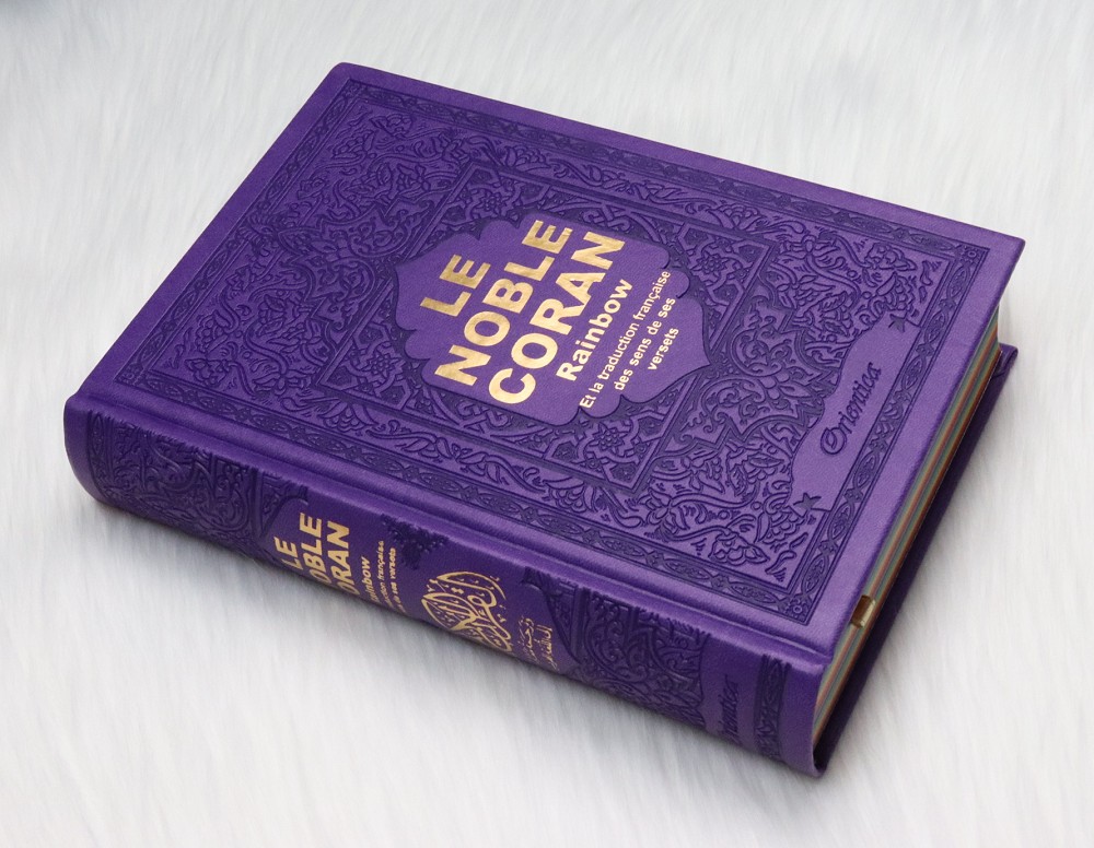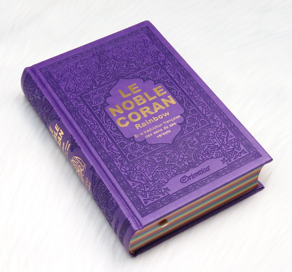Ce Coran Arc-en-ciel (en anglais "Rainbow Quran") a une couverture cartonnée de type cuir, doux au toucher.