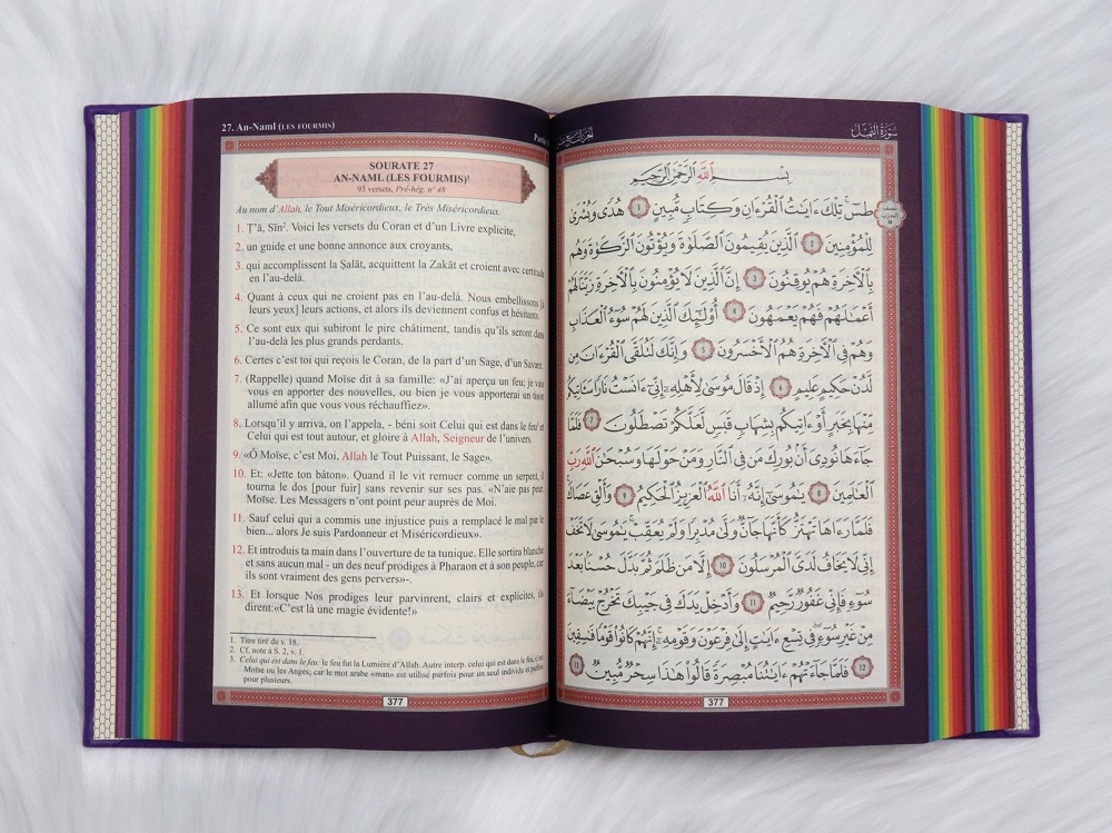 Dans ce magnifique Coran chaque partie (Jouz') est colorée avec une couleur différente, avec un dégradé de couleurs sous forme d'arc-en-ciel. Ce qui aide l'apprentissage et la révision du Saint Coran.