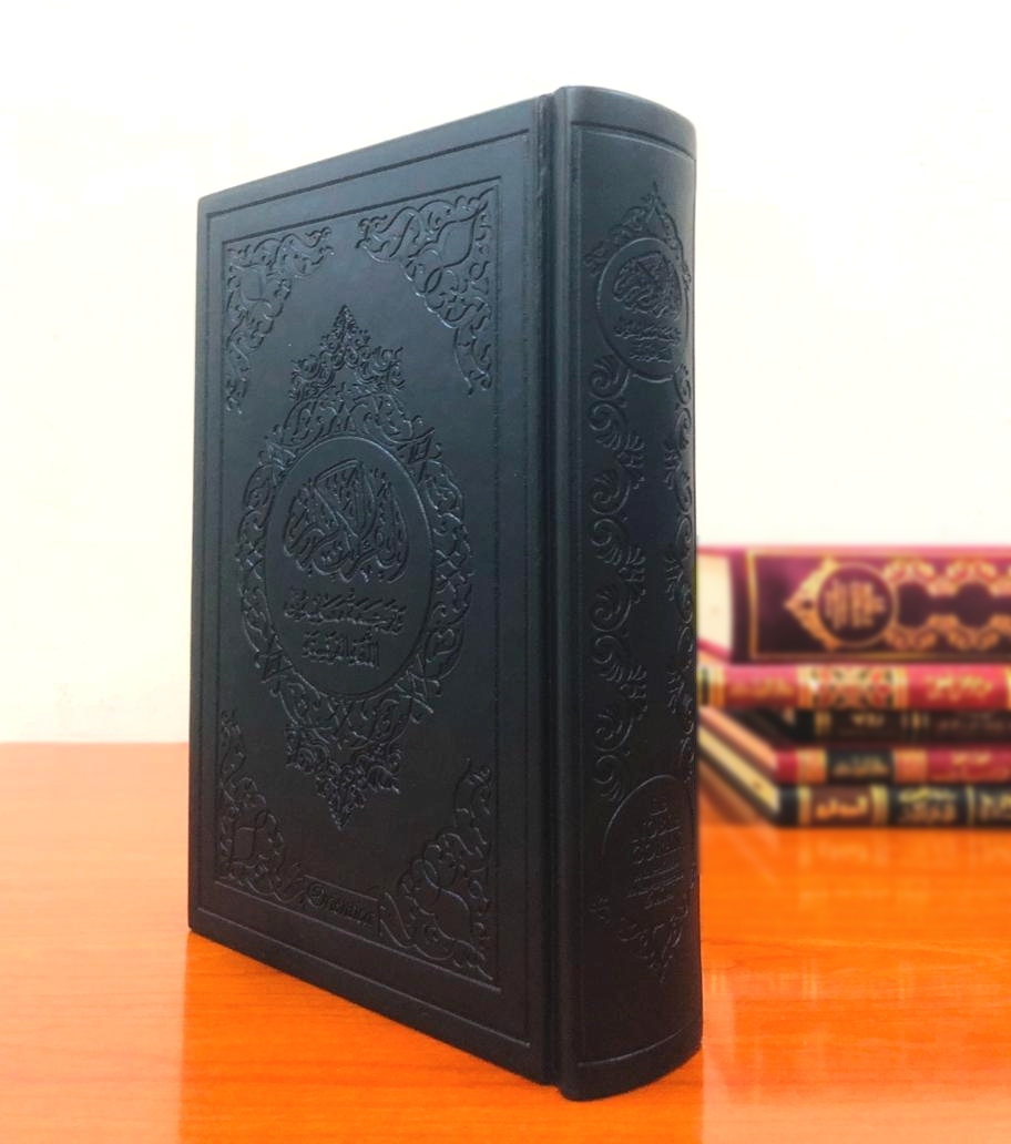 Avec index des sourates visible sur la tranche du livre permettant un accès plus rapide au début de chaque sourate. Pour les sourates longues, permet de connaître visuellement le nombre de pages qu'il nous reste à lire pour finir la sourate.