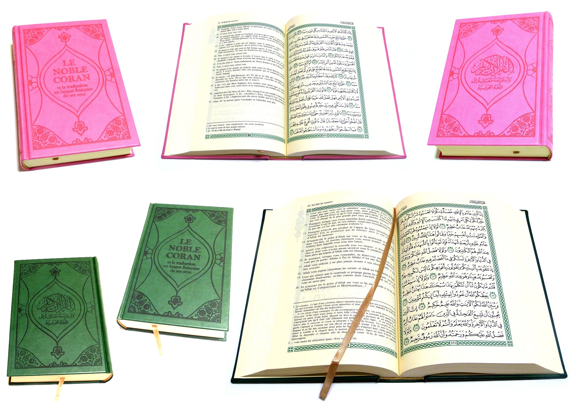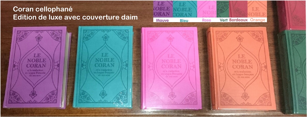 Pack de 5 Corans de luxe en 5 couleurs différentes : Le Saint Coran (français - arabe - phonétique) - Couverture simili-cuir (Mauve, Vert, Bleu, Rose pâle, Rose) - REF. 15901 (129.50 €) - En Promotion à 95.00 €