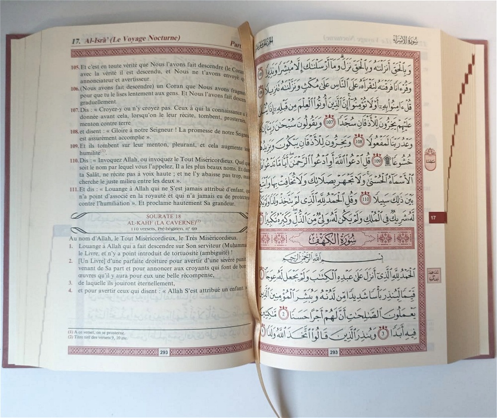 Avec index des sourates visible sur la tranche du livre permettant un accès plus rapide au début de chaque sourate. Pour les sourates longues, permet de connaître visuellement le nombre de pages qu'il nous reste à lire pour finir la sourate.