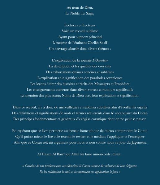En espérant que ce livre permette au lecteur francophone de mieux comprendre le Coran. Qu'il puisse mieux le lire et le retenir, le réviser et le méditer, l'appliquer et l'enseigner, afin que ce Coran soit un argument pour nous et non contre nous au Jour du jugement.
