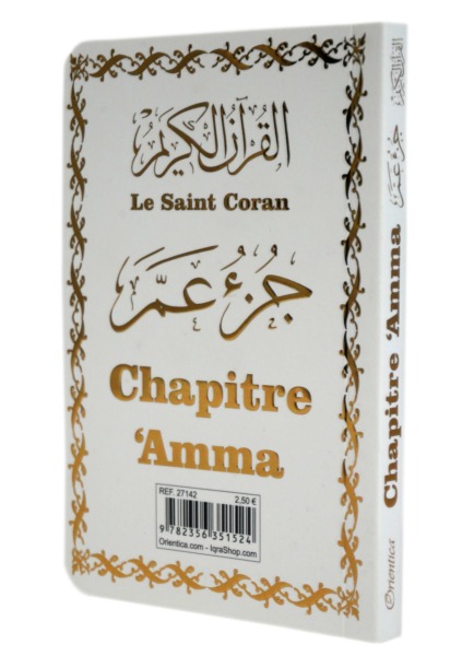 Couverture blanche dorée. Contient Juz' 'Ammâ complet : Hizb 'Amma et Hizb Sabbih avec toutes les petites sourates du Coran. Le Coran, Al-Qur’ân, signifiant « la récitation », constitue le texte sacré de l’islam qui correspond à la Parole divine révélée au Prophète Muhammad (PBDSL), le meilleur des hommes. Il est également le pilier sur lequel reposent la prière du musulman, son comportement et toute sa vie.
