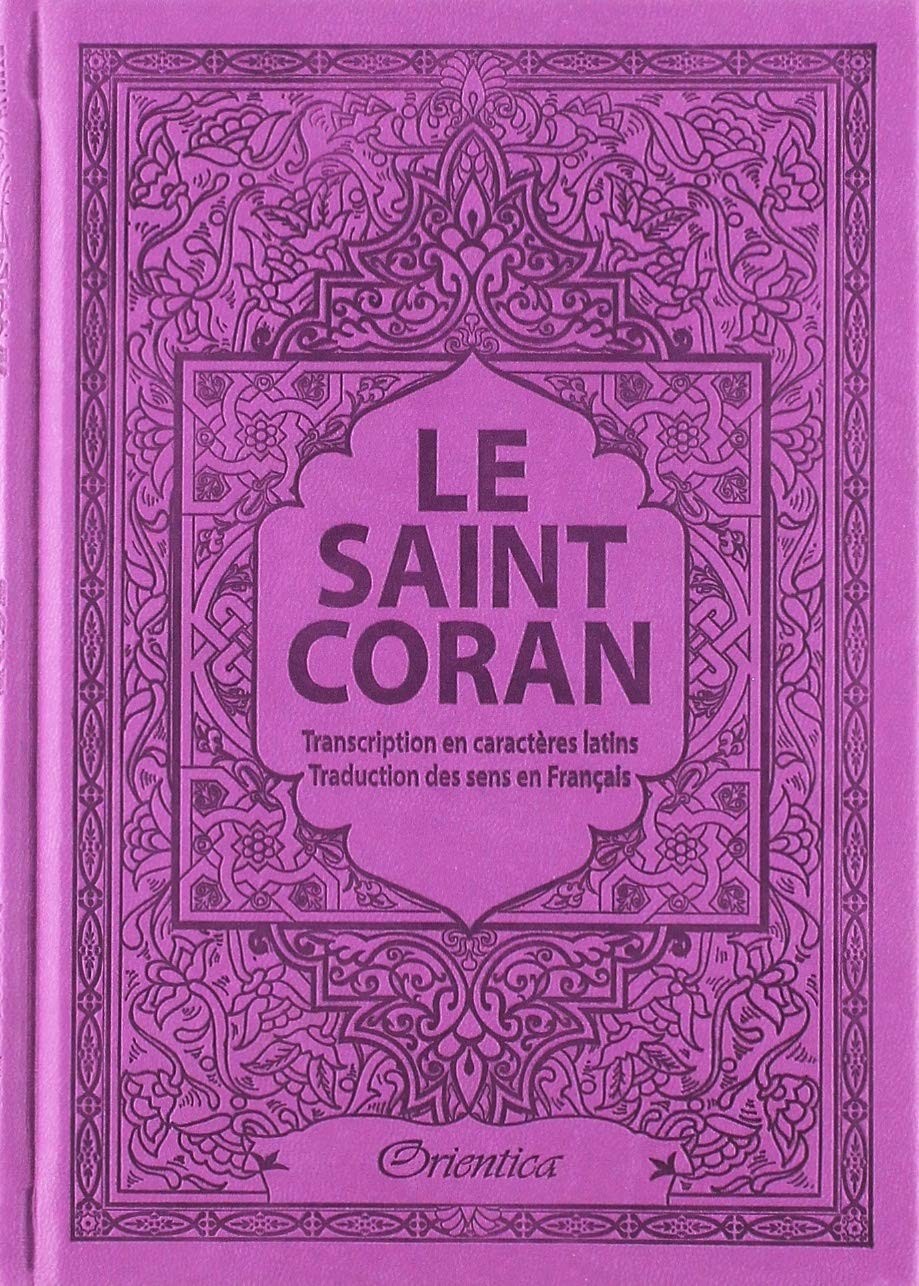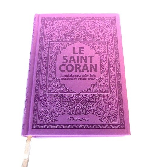 Le saint Coran avec versets en arabe, traduction française + transcription phonétique (translittération de l'arabe en caractères latins). Impression couleur, avec marque page intégré.