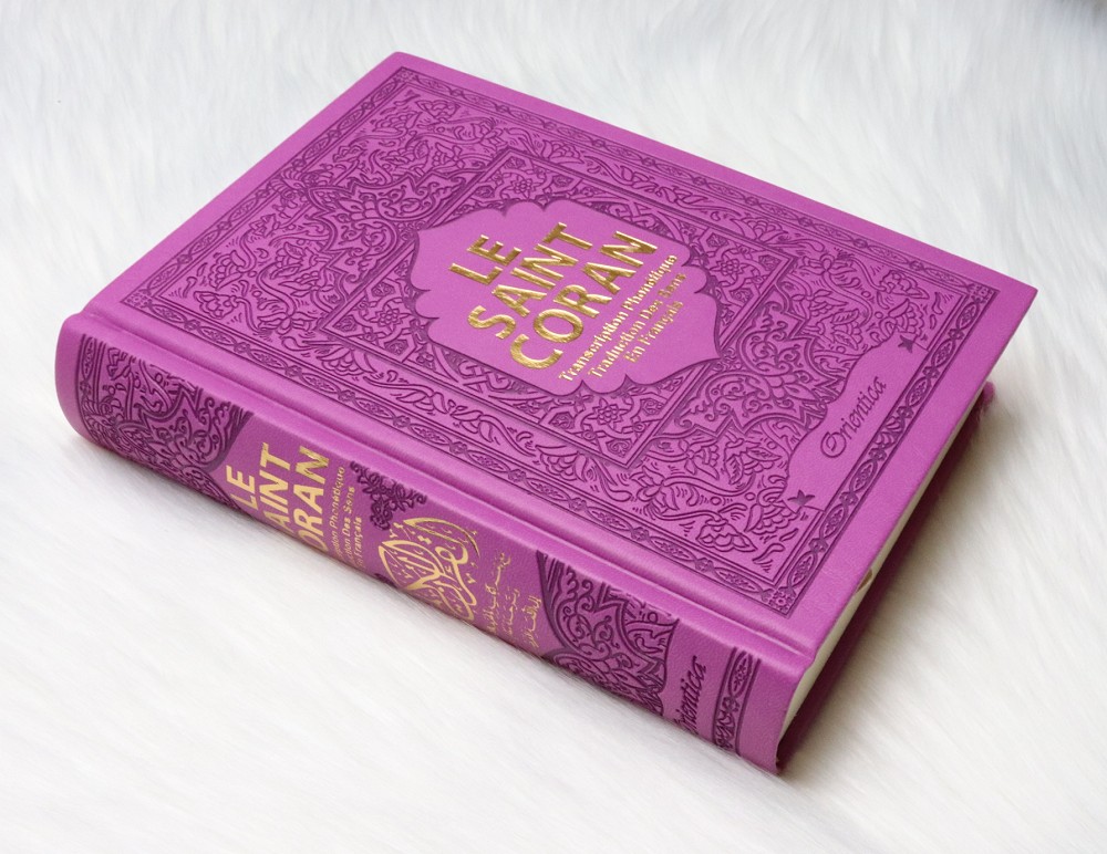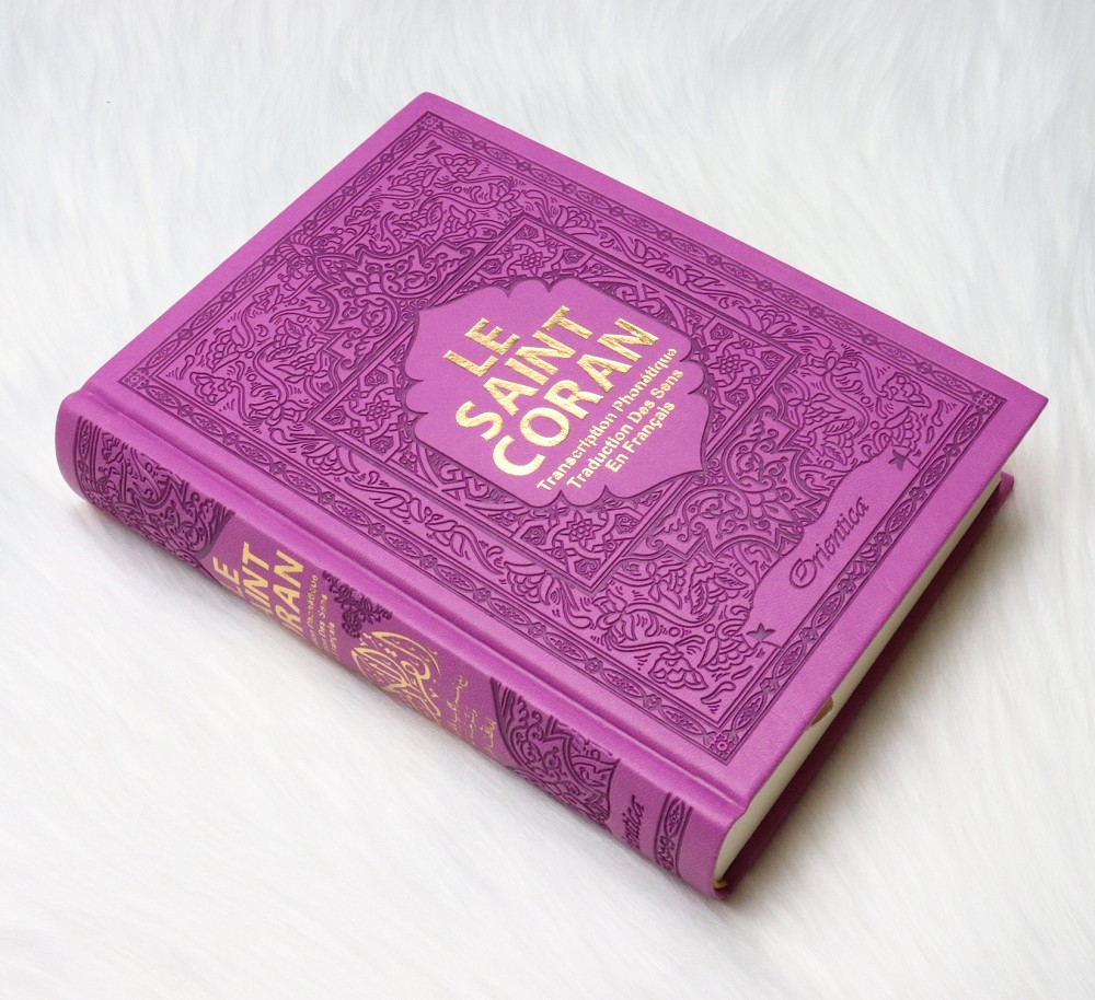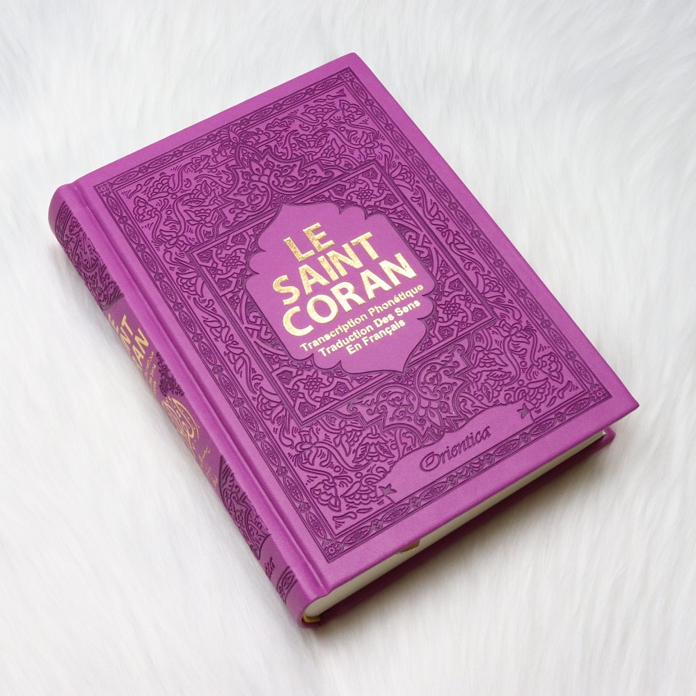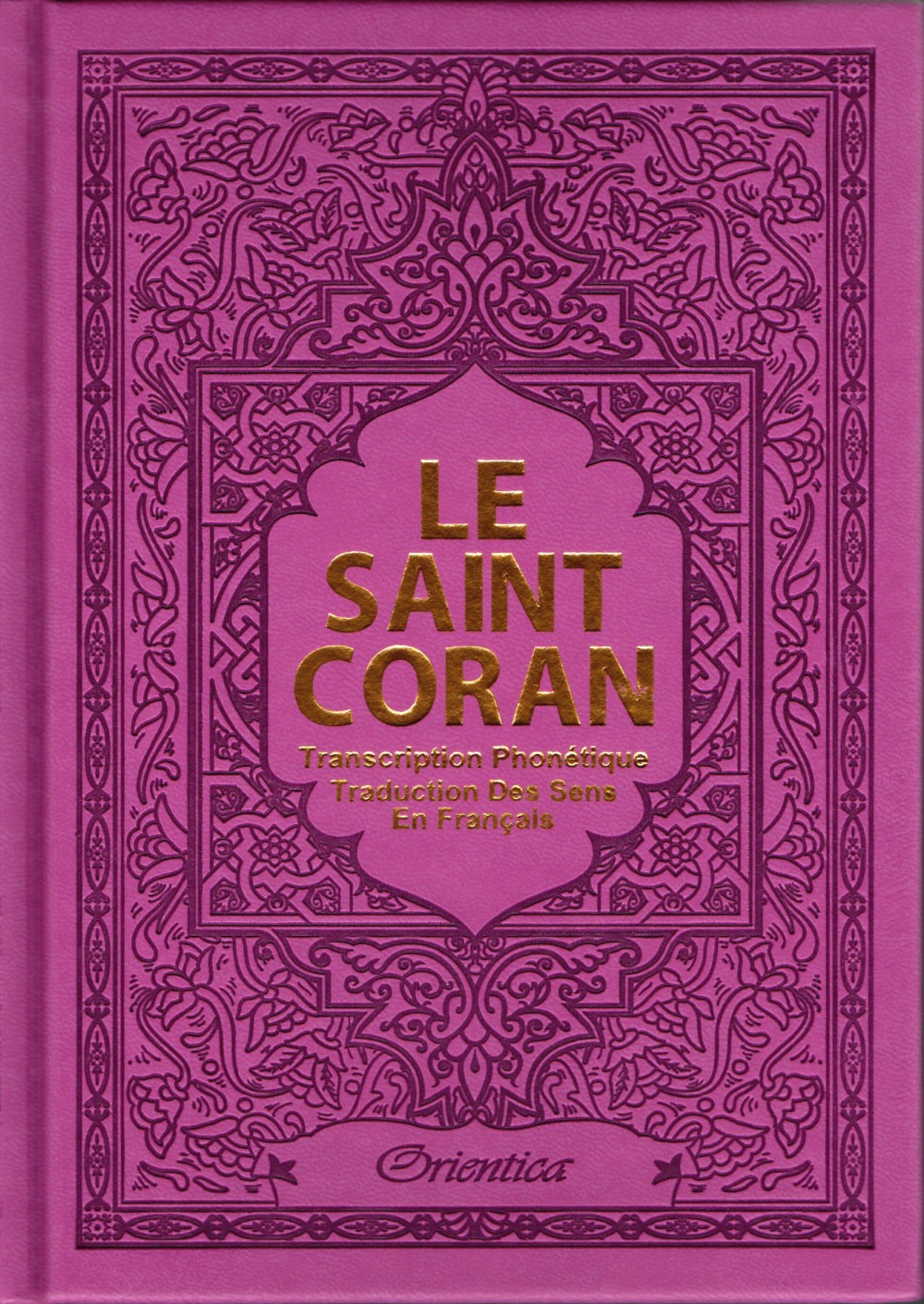 Le saint Coran avec versets en arabe, traduction française + transcription phonétique (translittération de l'arabe en caractères latins). Impression couleur, avec marque page intégré.