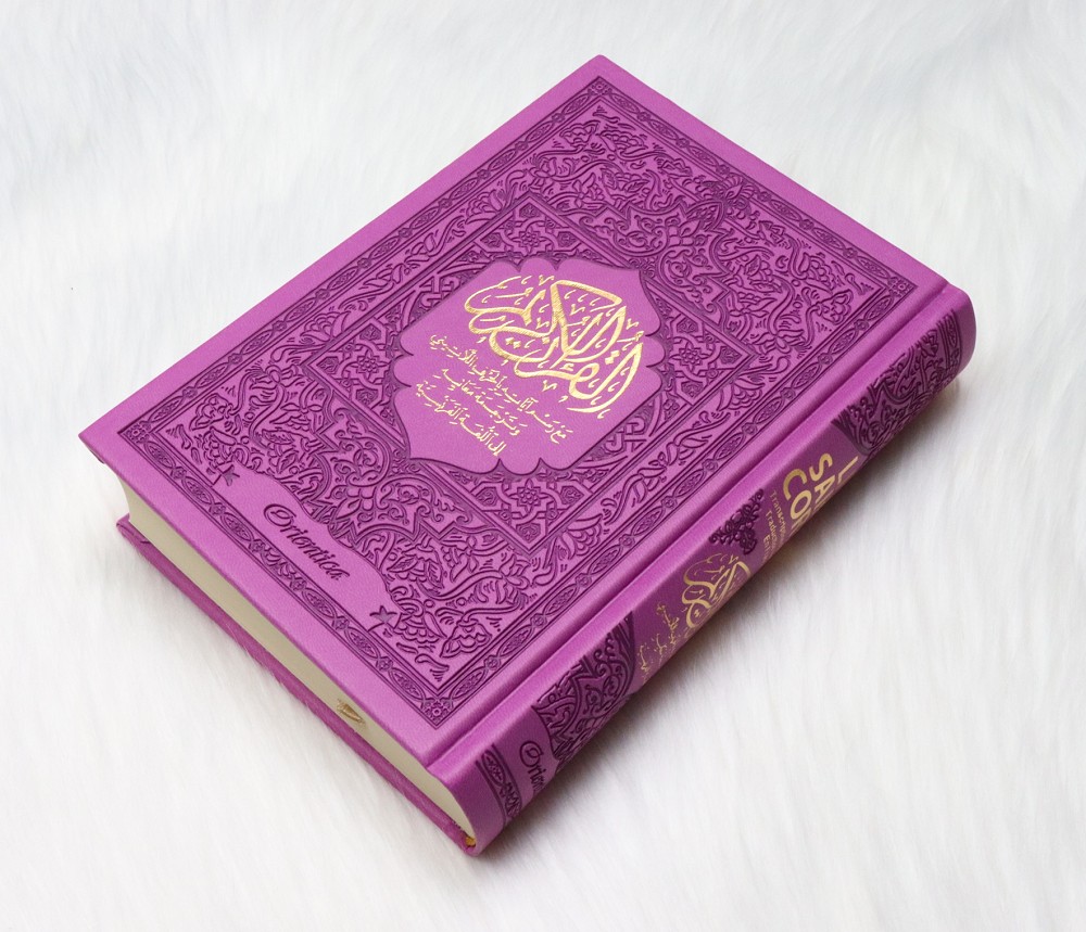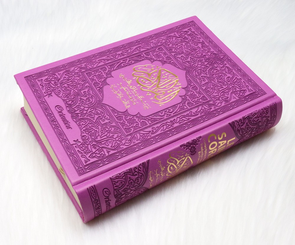 Magnifique Coran avec couverture cartonnée de type cuir doux au toucher. Très jolie couleur mauve dorée. Idéal pour offrir.