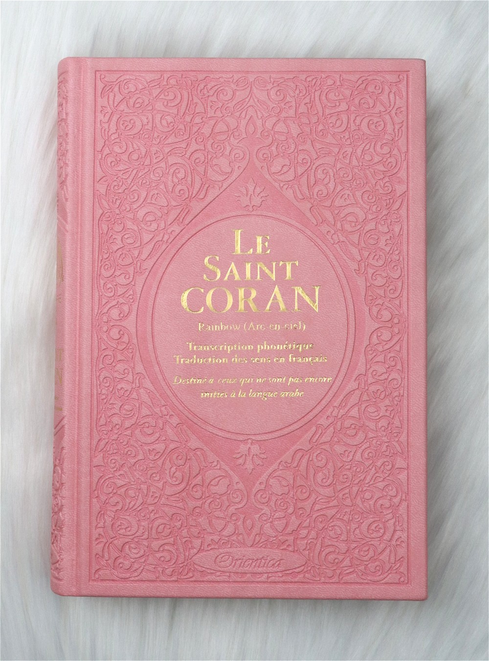 Le Saint Coran Rainbow (Arc-en-ciel) - Bilingue français/arabe avec transcription phonétique - Edition de luxe - Couverture Cuir Rose Clair doré Livre Coup de coeur